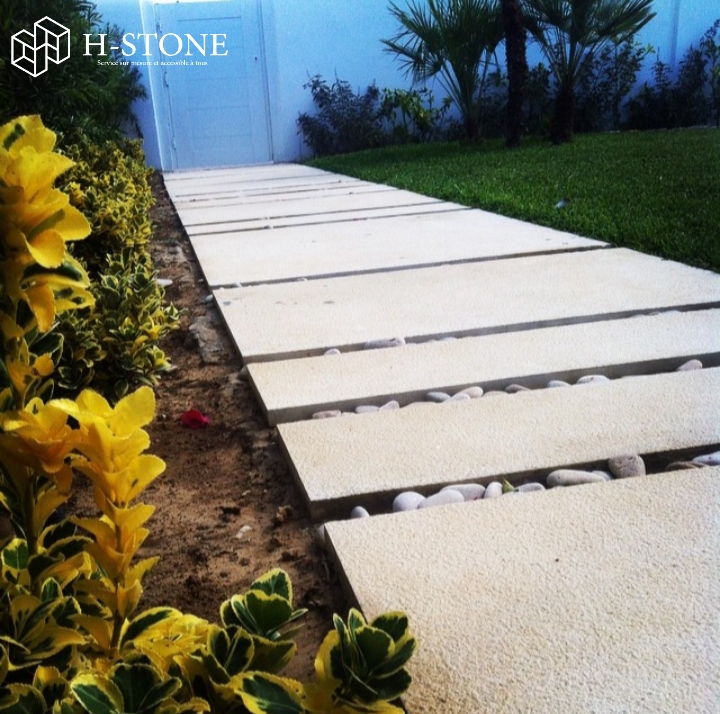 Margelle en pierre de taza beige aspect vieilli. L’aspect est une finition donnée à la pierre de taza, qui la rend légèrement structurée et irrégulière. De la même finition et de la même pierre naturelle que le Dallage, la margelle beige est disponible avec des bords arrondis ou des bords droits.